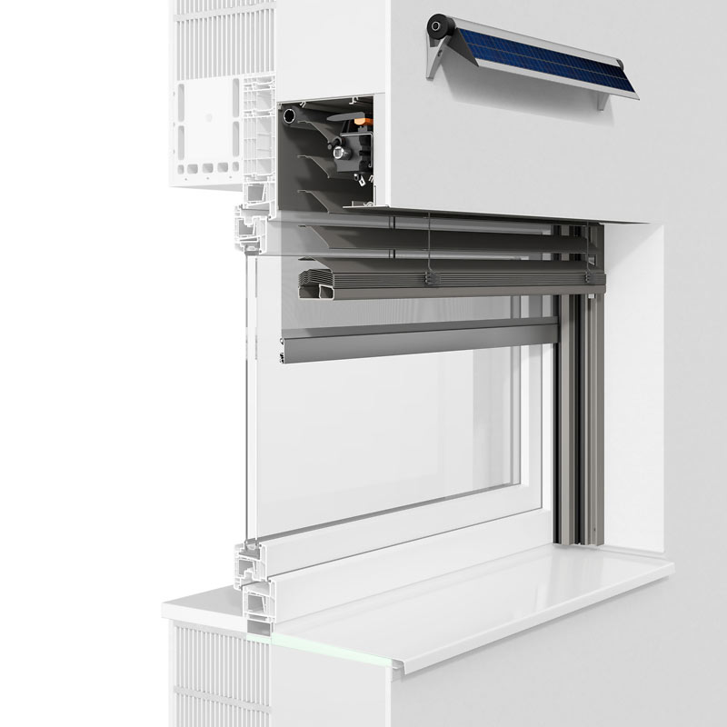 Sie können Ihren motorisierten ROMA Sonnenschutz auch mit Solarantrieb und Speicherakku betreiben. Das Solarmodul in der neuen Ausführung "Somfy io Funk" oder in der bekannten Ausführung „Elero Funk“ lässt sich, je nach Bausituation, direkt auf den Kasten oder an die Hauswand montieren.