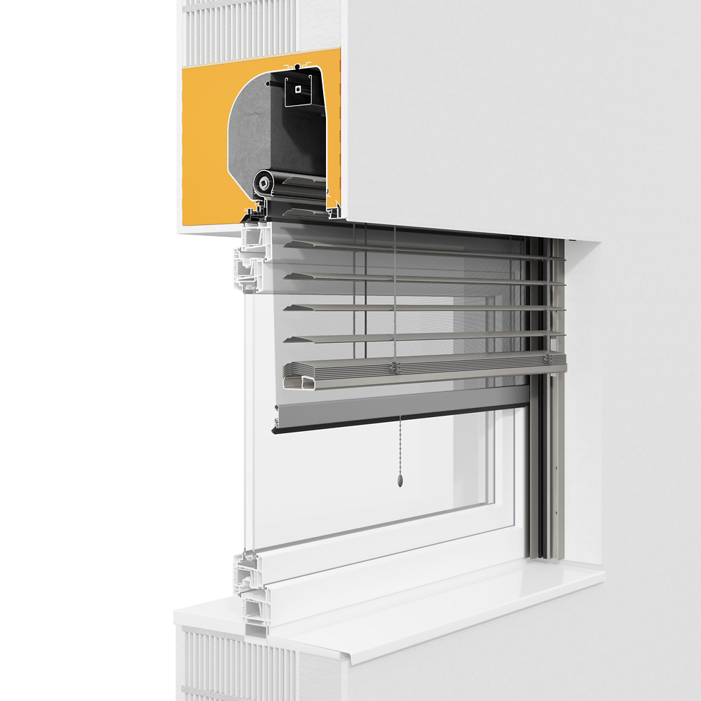 Aufsatzraffstorensysteme gibt es für Putz- und Klinkerfassaden inklusive der möglichen Auf- und Nachrüstung mit integriertem Insektenschutzgitter oder Motorbetrieb.